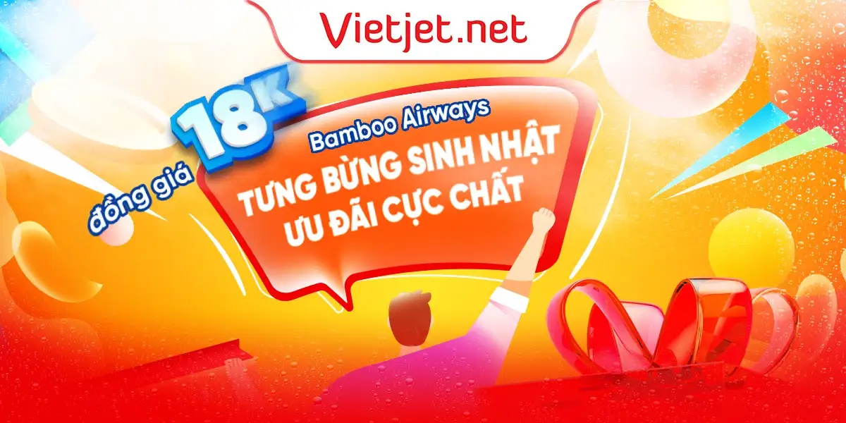 Ưu đãi mừng sinh nhật Bamboo Airways – Đồng giá 18K. Mừng kỷ niệm sinh nhật lần thứ 5 năm, Bamboo Airways xin gửi tới khách ưu đãi “khủng’ giảm giá cực hời cho tất cả các chặng bay nội địa và quốc tế. Bạn đã sẵn sàng tham gia vào “đại tiệc siêu sale” để cùng chúng tôi tri ân và chào mừng tuổi mới đầy hứa hẹn của Bamboo Airways chưa?